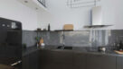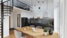 W kompozycji z antresolą ciemna tonacja dominuje głównie w aneksie kuchennym. Wzrok przyciąga designerska czarna lodówka. Zlewozmywak i bateria niemal wtapiają się w tło grafitowych, połyskujących płytek i zabudowy meblowej. Bateria zwraca jednak uwagę interesującym „technicznym” designem. To model Libretto z wyciąganą wylewką w czarnym kolorze – elastyczną, o funkcji obrotowej. Bateria ma wygodny przełącznik strumienia napowietrzonego i natrysku. Wyposażona jest też w regulator ceramiczny.