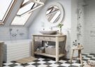 Właściciele niedużych łazienek powinni zainteresować się stylizacją w odcieniu white – przytulną, spokojną. Są tu pełne wizualnego ciepła elementy drewniane i elegancka podłoga w biało-czarną szachownicę. W strefie prysznica uwagę zwraca zestaw natryskowy przesuwny z deszczownią Squerto Lux.