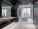 W przykładowym, luksusowym salonie kąpielowym – ze ścianami pokrytymi ciemnymi kaflami o fakturze antracytu – strefa prysznica jest praktycznie niezauważalna. Posadzka w białym marmurze stanowi jednolitą płaszczyznę w całym pomieszczeniu. Odpływ niemal „wtapia się” w linię ściany i podłogi. „Niewidzialna” jest również szklana ścianka, wysoka po sam sufit.