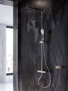 W komplecie z deszczownią jest bateria natryskowa o klasycznej, okrągłej formie. Została wyposażona w regulator termostatyczny oraz – zintegrowany z regulatorem przepływu – przełącznik ceramiczny deszczownia/rączka natryskowa. Dzięki specjalnej blokadzie gorącej wody nie trzeba się obawiać poparzenia, co jest szczególnie ważne, gdy z łazienki korzystają dzieci i osoby starsze. Blokada safe stop 38°C umożliwia ustawienie optymalnej temperatury wody. Równie istotnym elementem zestawu jest natrysk ręczny umieszczony na przesuwnym uchwycie. Płaska rączka o średnicy 10 cm posiada trzy funkcje strumienia. Tak jak deszczownia, ma praktyczny system łatwego usuwania kamienia wapiennego easy clean.