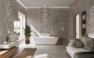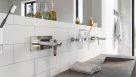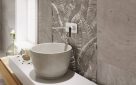 Ten wytworny pokój kąpielowy w klimacie SPA przypomina raczej ekskluzywne pomieszczenie do wypoczynku niż klasyczną łazienkę. Z płytkami ściennymi 3D o roślinnych motywach zdają się zlewać białe i srebrne elementy baterii umywalkowej Adore White/Chrome. Kolor oraz minimalistyczny design sprawiają, że są niemal niewidoczne nad misą eleganckiej umywalki. Wylewka posiada perlator, który przyjemnie napowietrza strumień wody i jednocześnie zmniejsza jej zużycie. Aby zapewnić maksimum komfortu wanna została wyposażona w wielootworową baterię, której większość elementów także została ukryta w specjalnej obudowie.