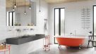 Choć styl industrialny lubi nieosłonięte rury, kable i elementy instalacyjne, w nowoczesnym wnętrzu efekt ten uzyskamy wybierając odpowiednie dodatki, takie jak oświetlenie w postaci żarówek zwisających na długich kablach, czy naścienny grzejnik ze srebrnych rurek. Komfortowe umycie rąk zapewni umywalkowa bateria podtynkowa Algeo, a przyjemną kąpiel bateria wannowa z natryskiem punktowym. Model Algeo wyróżnia minimalistyczny design. Owalna rączka dobrze leży w dłoni, a zastosowany regulator ceramiczny jest odporny na rozszczelnienie przez co cechuje się wysoką niezawodnością. Chromowana maskownica o kształcie zbliżonym do płytek harmonizuje ze strukturą ściany. Niezabudowana wanna w barwie miedzi to najmocniejszy akcent kolorystyczny w tym biało-szarym pomieszczeniu – wraz ze stolikiem na kosmetyki w podobnym kolorze nadaje wyrazistości stylizacji.