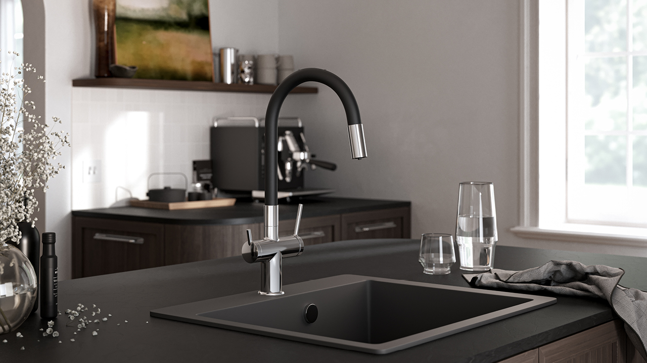 Bateria kuchenna FILTRATA to propozycja dla tych, którzy chcą pić smaczną i zdrową wodę z kranu. Bez instalowania dodatkowych kraników i dzbanka filtrującego na blacie. To właśnie daje FILTRATA – wodę filtrowaną i użytkową z jednej baterii. Jeden korpus, jedna wylewka, dwie dźwignie – prosto, wygodnie i estetycznie.