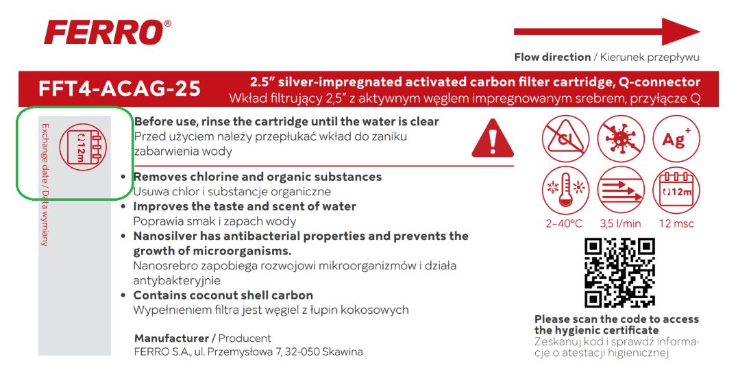 Na korpusie wkładu znajduje się miejsce na wpisanie daty uruchomienia oraz sugerowanego terminu wymiany filtra (6 miesięcy dla wkładu 2″ i 12 miesięcy dla wkładu 2,5″)
