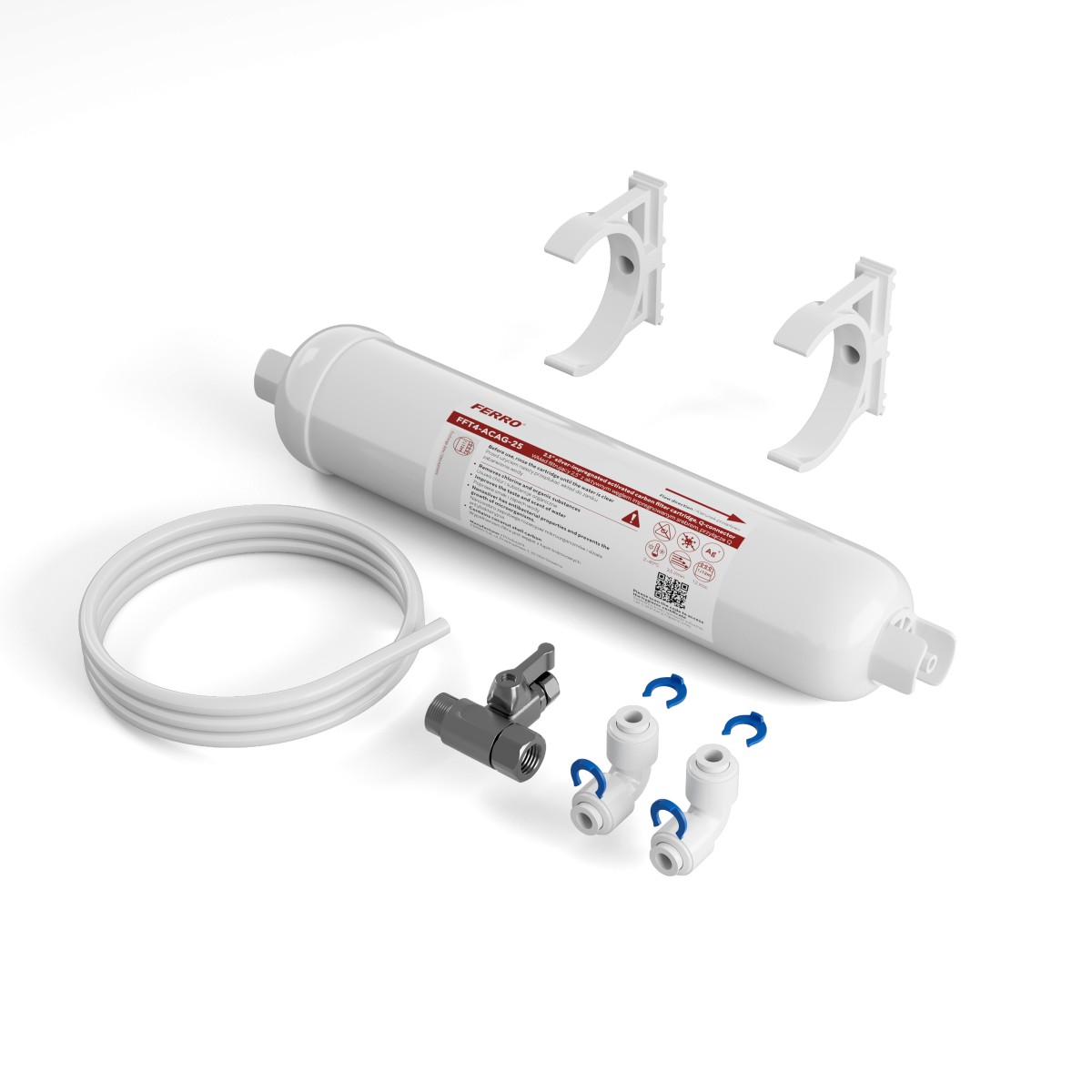 - dwa szybkozłącza kątowe Q (Quick Connect) typu push-fit z niebieskimi klipsami zabezpieczającymi,