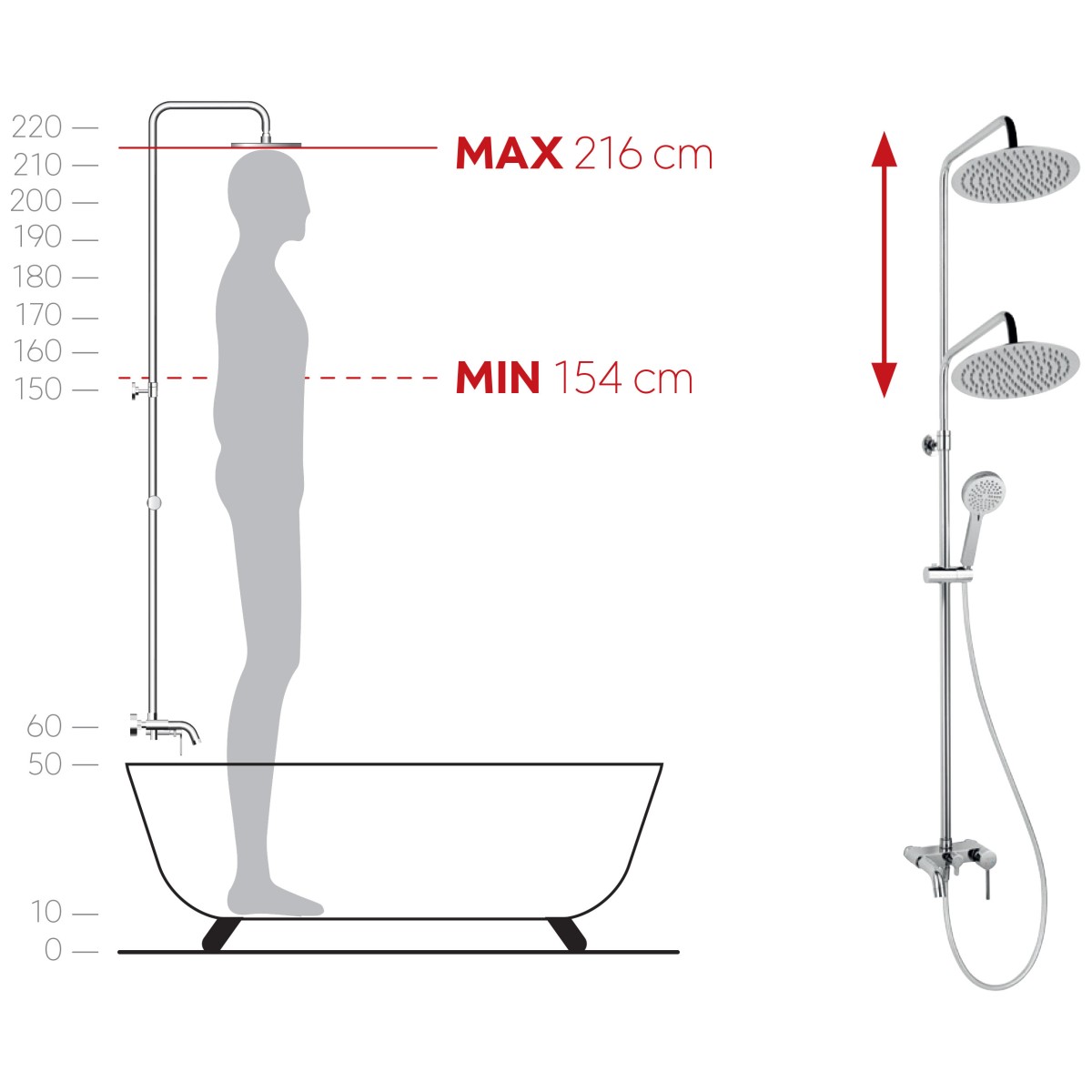 Regulowana wysokość drążka natryskowego: