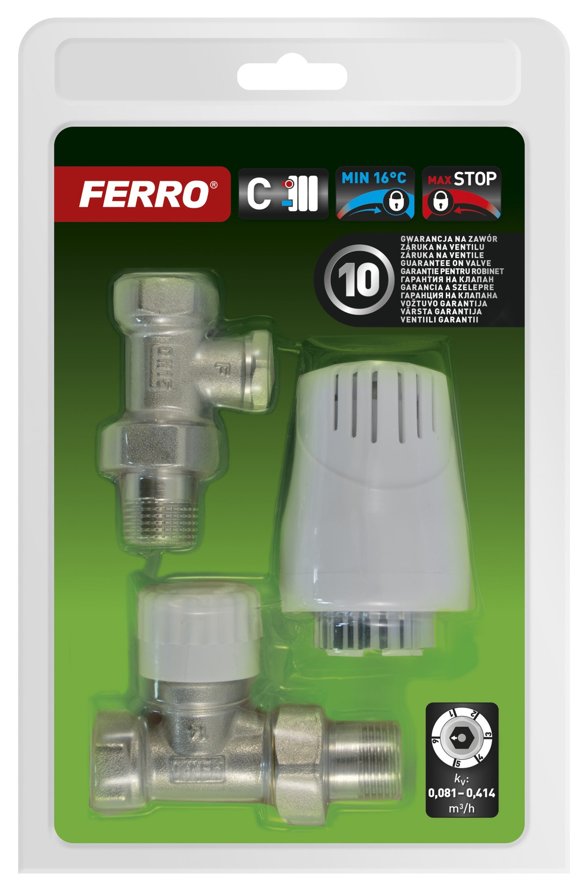 Zestaw termostatyczny prosty 1/2” z zaworem z nastawą wstępną i głowicą z ograniczeniem od 16°C