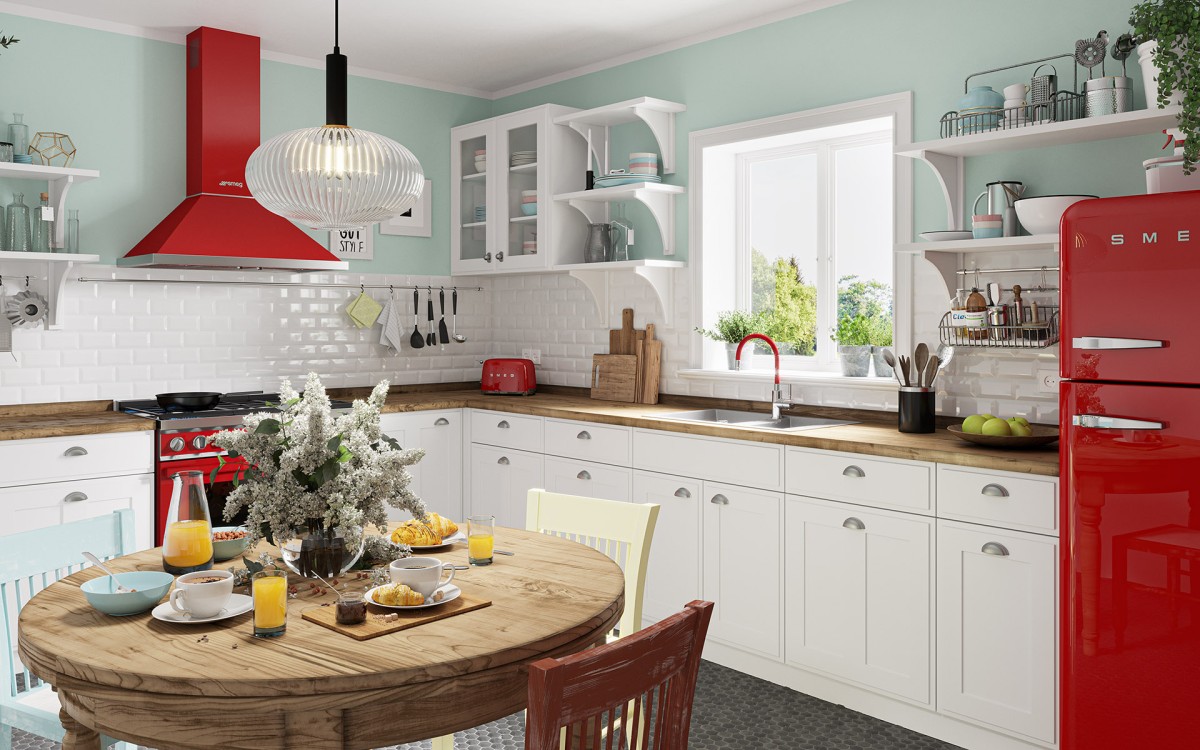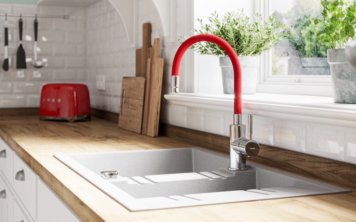 Bateria zlewozmywakowa z czerwoną, elastyczną wylewką