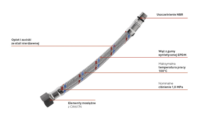 wysoka jakość gumy syntetycznej, z której wykonany jest wewnętrzny przewód sprawia, że przyłącze jest odporne na starzenie i naprężenia mechaniczne