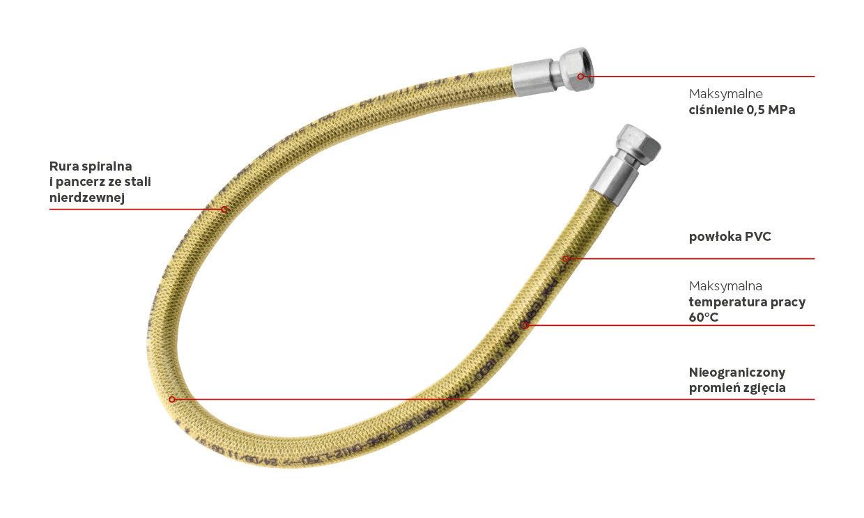 - zastosowanie: do przyłączania urządzeń domowych wewnątrz i na zewnątrz mieszkań, z zasilaniem gazem o ciśnieniu niższym niż 0,5 bar. Odpowiedni do używania w miejscach objętych przepisami dotyczącymi reakcji na ogień