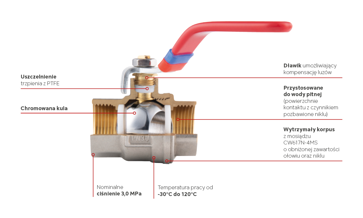 zawory przystosowane do wody pitnej – powierzchnia, która ma kontakt z wodą pitną (wnętrze zaworu oraz gwinty przyłączeniowe) nie jest niklowana.