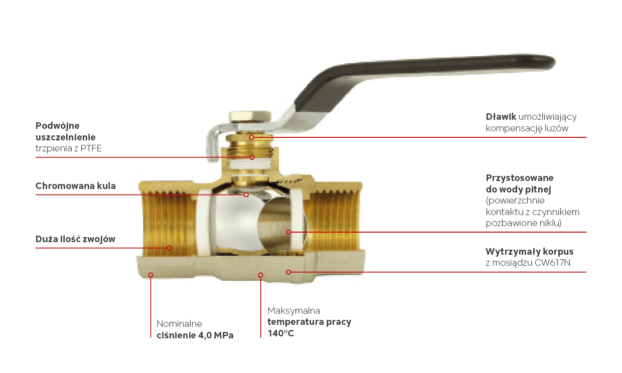 zawory przystosowane do wody pitnej – powierzchnia, która ma kontakt z wodą pitną (wnętrze zaworu oraz gwinty przyłączeniowe) nie jest niklowana